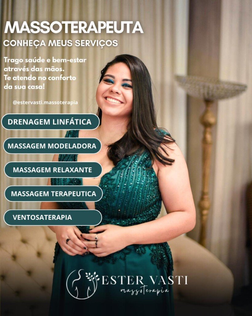 Sou Ester Vasti, massoterapeuta em Goiânia. Minha missão é transformar sua rotina através de protocolos personalizados que unem estética e bem-estar. Com técnicas avançadas e atendimento acolhedor, ajudo você a conquistar um corpo mais leve e uma mente equilibrada. Invista no seu maior patrimônio: você.